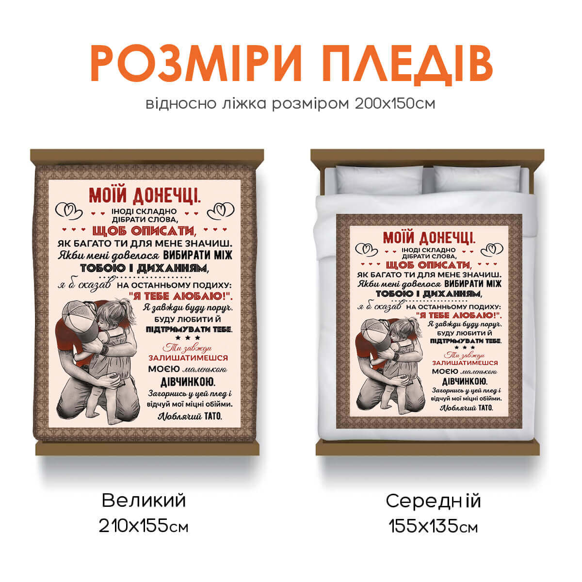 Додайте улюблені фото родини, дітей, домашніх улюбленців чи кадри з улюбленого фільму або аніме. Додайте ім’я, ніжне привітання чи ваші особисті «теплі слова» — і ми перетворимо їх на плед, що зігріває не тільки тіло, а й серце.